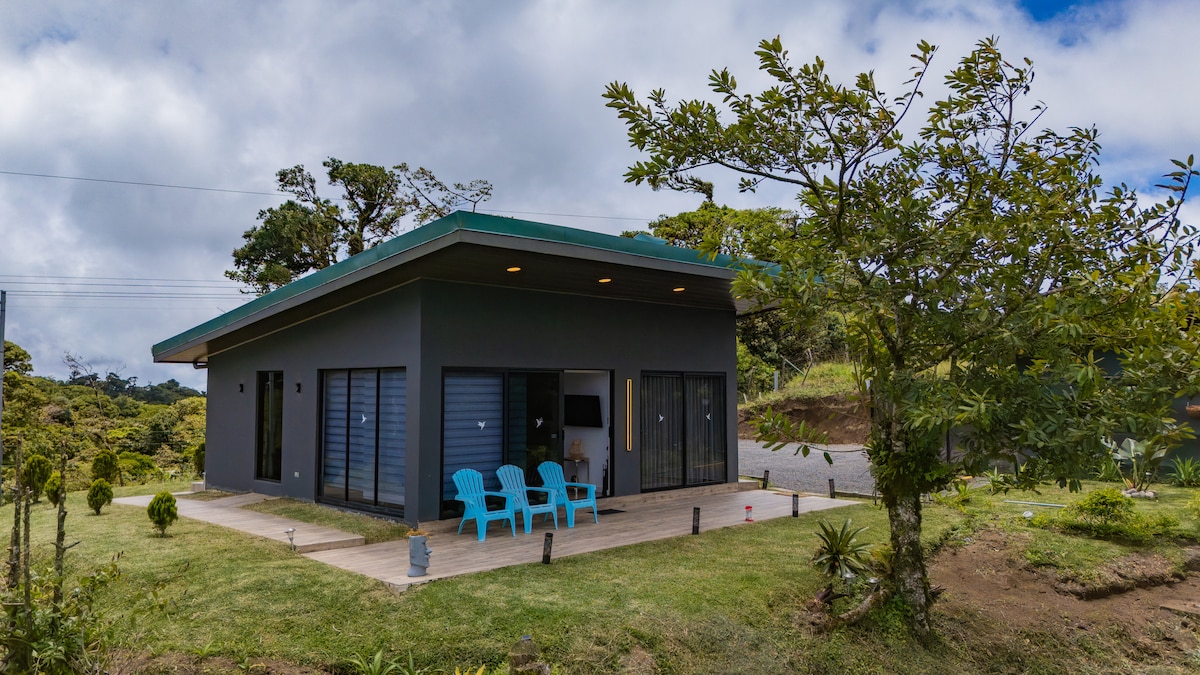 Welcome to our newly built Monteverde gem, offering stunning views of the sea and mountains. This cozy, peaceful cabin features two bedrooms, a fully equipped kitchen, a comfortable living room, and a full bathroom. Ensuring your security, we provide private internal parking. Conveniently located, we are just 5 minutes from a supermarket and gas station, and 10 minutes from local dining and shopping. Experience the perfect blend of tranquility and accessibility in this charming retreat.