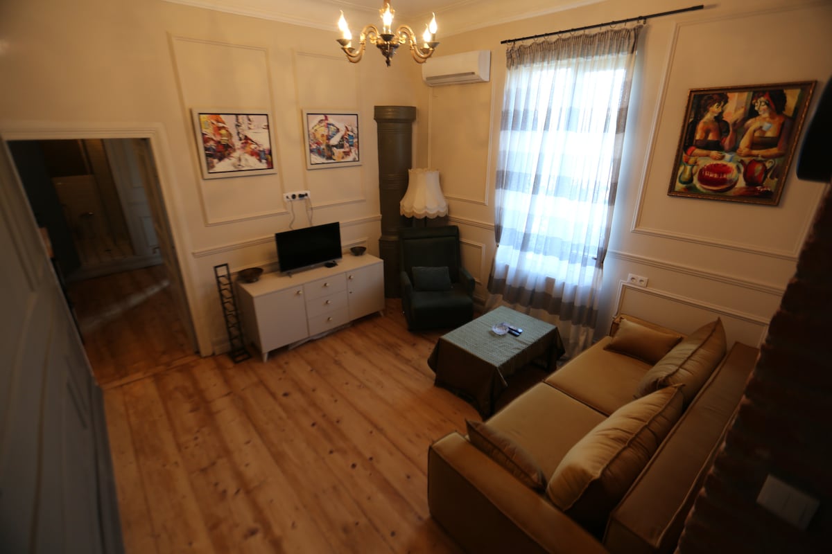 2 bedroom Apartment in a 19th Century Historical House, by the LIBERTY SQUARE and Kote Apkhazi Street. The apt. is on the second floor. Newly renovated and well designed apartment, can accommodate up to 4 persons. Apt. is located in the very center of Old Tbilisi, " Sololaki" district. The apartment has an amazing view on the monument of Kartlis Deda and Narikala Fortress.