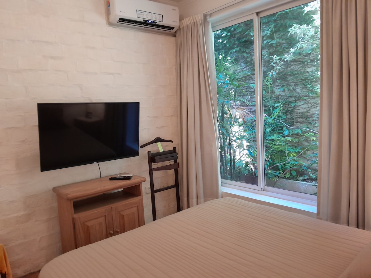 Desconecta de tus preocupaciones en este espacio amplio y sereno. Cerca de bares, restaurantes de moda, malls, buses y metros. Tiene todo lo necesario para una estadía perfecta: - Excelente wifi -Sommier queen -Aire acondicionado -TV '43 -Sofá - Mesa comedor/espacio de trabajo -Microondas, anafes eléctricos pava y tostadora eléctricas -Refrigerador -Amplio vestidor con espacio de guardado -Baño en suite con ropa blanca - Terraza con mesa y sillas para disfrutar del aire libre