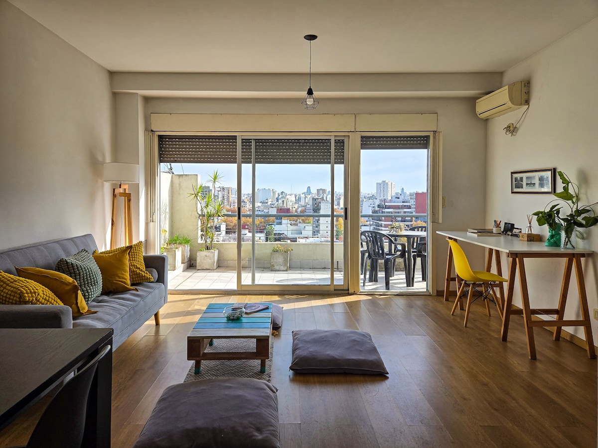 Desconecta de tus preocupaciones en este espacio amplio y sereno. Cerca de bares, restaurantes de moda, malls, buses y metros. Tiene todo lo necesario para una estadía perfecta: - Excelente wifi -Sommier queen -Aire acondicionado -TV '43 -Sofá - Mesa comedor/espacio de trabajo -Microondas, anafes eléctricos pava y tostadora eléctricas -Refrigerador -Amplio vestidor con espacio de guardado -Baño en suite con ropa blanca - Terraza con mesa y sillas para disfrutar del aire libre