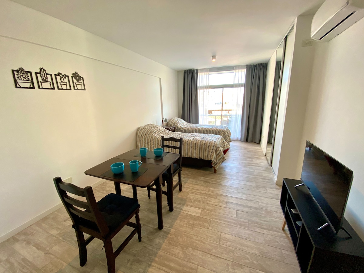 Disfruta de la sencillez de este alojamiento tranquilo y céntrico. Cómoda cama (Opcional 1 matrimonial o 2 simples), Baño completo con ducha/bañadera Aire frio/calor 3000 Frigorías Mesa con sillas y una cocina completa (heladera, pava eléctrica, tostadora, microondas, utensilios de cocina y vajilla) Cuenta con un balcón a la calle con una hermosa vista además de una terraza con parrilla, cuenta con ropa blanca y de cama.