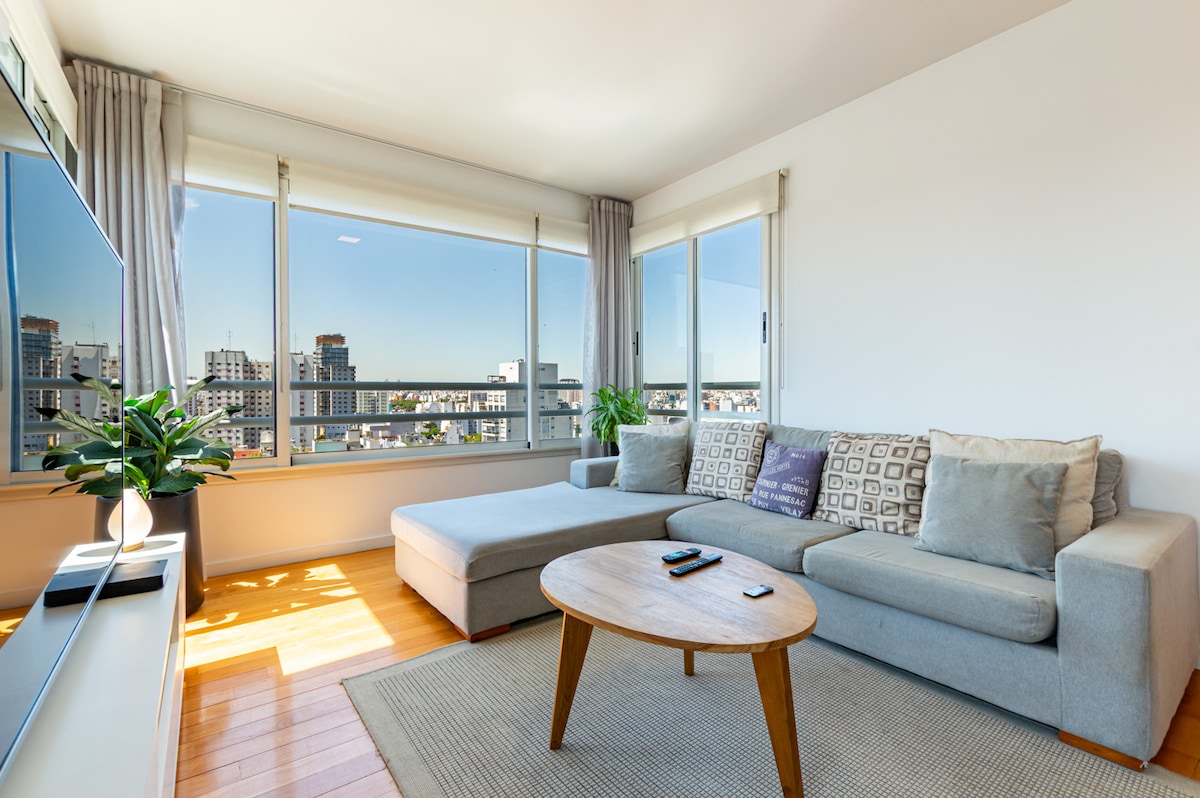 Espacio tranquilo, luminoso, elegante y cómodo para relajarte. Ubicado en una de las zonas mas lindas y cómodas de la Ciudad de Buenos Aires. El departamento cuenta con grandes ventanales que hacen que la vista sea única. Cuenta con 2 habitaciones: una de ellas con una cama matrimonial y TV, la otra con dos camas y un escritorio por si necesitas trabajar. 1 baño completo y 1 toilette. Living comedor con TV y cocina. El edificio cuenta con, pileta, sum, laundry y gimnasio.