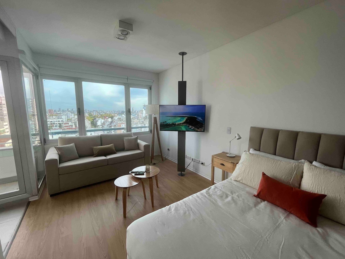 Beautiful brand new studio, fully furnished with excellent quality equipment -TV 32' with cable/Netflix, WIFI 100 MB, A/C hot-cold, King Size bed, desk, full kitchen, -in a Hotel style building with 24 Hs security, swimming pool, Gym, laundry. Located in the heart of Palermo Soho: 200 mts. from subway D/Plaza Italia (Santa Fe Av.), close to stores, bars, restaurants, shopping malls, parks, museums and with easy access to downtown and many touristic spots!