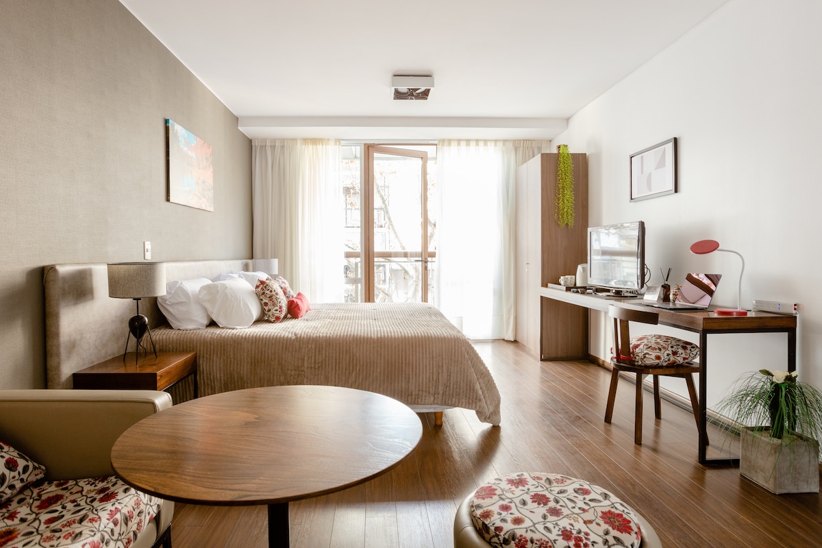 Luxury apartment in the famous Faena Hotel Buenos Aires. It is located within the Hotel complex. You have access to all services (swimming pool, gym, spa, restaurants, etc.) Designed by Phillipe Stark, furnished and decorated. It has 50 square meters (475 square feet) and 1 King bed. High speed WI Fi, a/c & central heating, cable TV, internet, Nespresso coffee machine, electric oven & cooktops, microwave, refrigerator, sheets, towels, 24 hour security and concierge service.