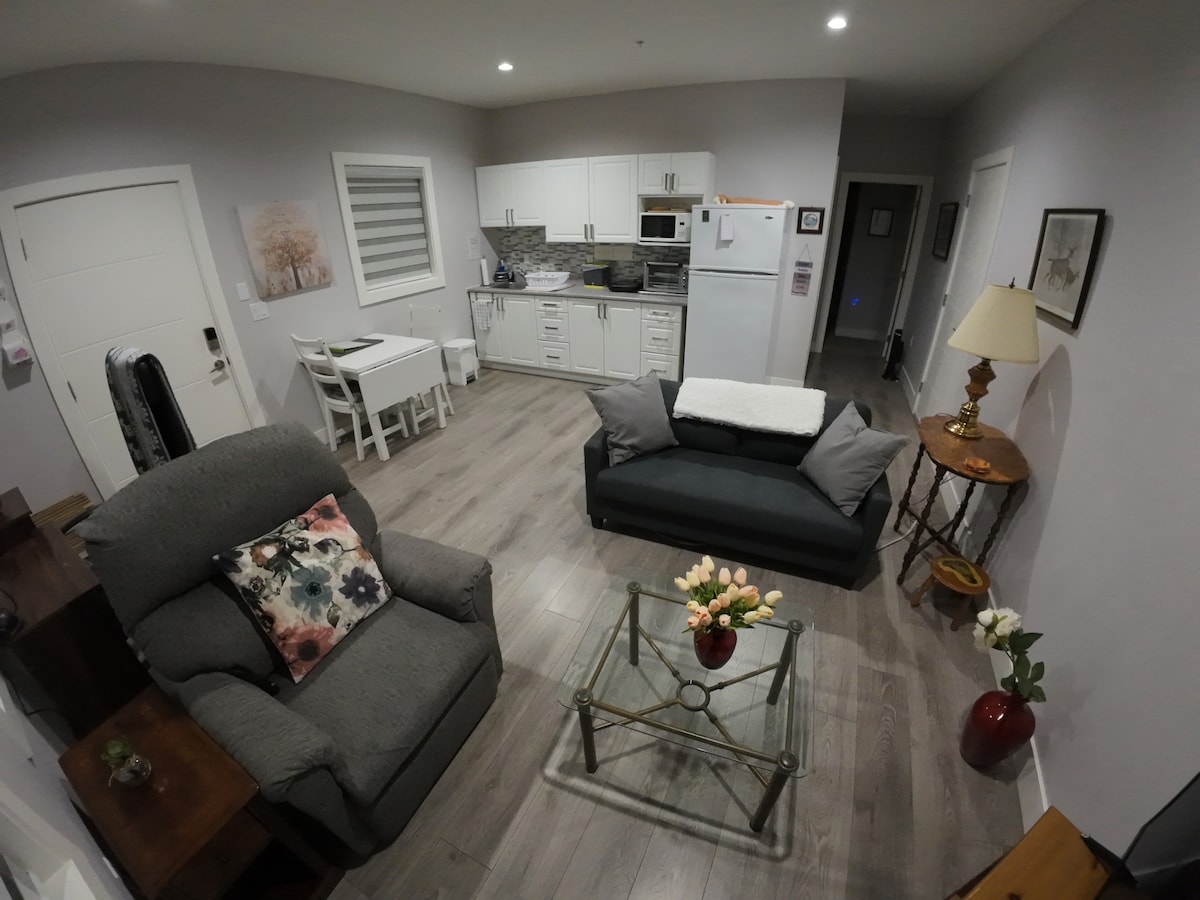 Our cozy and comfortable 2-bedroom ground floor guest suite with indoor fireplace and office space is a great vacation home for a getaway with your friends and family. This suite is a great option for business travelers, students and families. This home provides easy access to Hwy 1, Mission, USA Border and is just minutes from walking trails, golf courses and Castle Fun Park. Conveniently located minutes away from restaurants, grocery stores and under 10 min drive to Sevenoaks Shopping Mall.