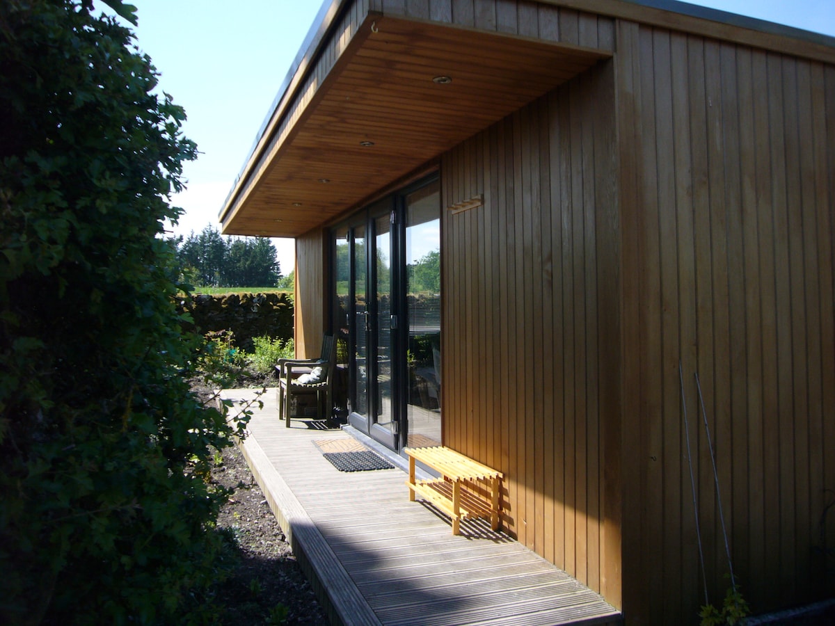 Heart of the Scottish Borders a hide away bungalow, spacious open plan living room and separate double bedroom and bathroom in an elevated position, far reaching views, no traffic, light and well insulated with lovely walks, ten miles from station to Edinburgh (1 hour). Nearest pub and cafe within 1 mile. Shops in Selkirk 5 Miles, Others in Hawick, Melrose, Galshiels, Jedburgh and Kelso Lots to see and do. Good for stars on clear nights.