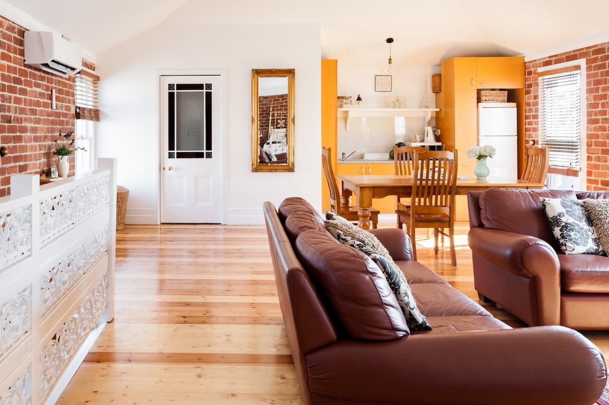 Peaceful loft‑style retreat in the heart of Albert Park. Large open‑plan space with polished floors, vintage charm and modern comforts. Relax in the king‑sized brass bed or unwind on leather sofas. Enjoy Wi‑Fi, TV including Netflix, air‑con, and a compact kitchenette. Private guests-only entrance. Unrestricted on-street parking using host's permit Parks, beach, and local dining all within a short stroll and a tram stop to Melbourne’s CBD only 70m away.