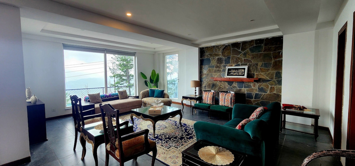 A luxurious serviced apartment with 180° picturesque stunning mountain views. It's a peaceful retreat 10 - 15 mins drive away from the busy Nathiagali bazar as you go towards Kalabagh Airforce Camp and take the forest road across the outskirts of the forest. The apartment has an additional private entertainment lounge with home cinema, snooker, table tennis and a racing sim Feel at home with staff consisting of a housekeeper and a cook. Heating, hot water, great wifi speed and solar backup.