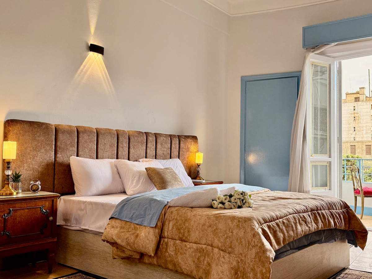 Elegant Downtown apartment with stunning square views, 2 suites + 2 bedrooms, hosting up to 8 guests. 3rd floor (no lift) with luggage assistance; earplugs provided to ensure a peaceful stay despite the vibrant city outside. Steps from cafés, bars, the Egyptian Museum, and Sadat Metro Station. Passports scanned copies should be provided upon booking. Note: Egyptian & Arab couples must provide a marriage certificate. Only approved visitors allowed. Parties not allowed.