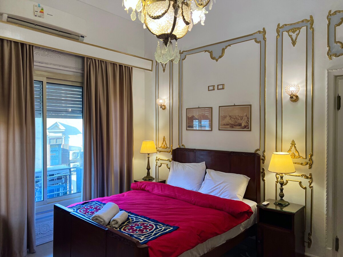 Experience classic Cairo with Mint Stays This beautiful vintage apartment brings the charm of old Cairo to life - high ceilings, gold doors, crystal chandeliers, and antique furniture. Relax on elegant sofas, dine at a carved wooden table, and enjoy the warm glow of vintage lamps and mirrors. Every corner has a touch of real history and comfort. Just steps from Khan el Khalili, Tahrir Square, Moez Street, and Abdeen Palace, you’ll stay in the heart of the city’s culture and heritage.