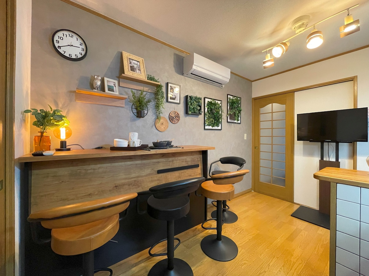 家は、こじんまりとした民家ですので、大人4人での利用が、余裕もあり満喫いただけるかと思います。この素敵な空間に滞在してみて下さい。 ★隣がBar★ですので22時頃迄は話し声や歌声がしますのでご了承下さい。 そのかわり、夜遅くまで音を気にせずにおしゃべり大丈夫です。地下鉄花園町駅のすぐ近くに、癒しの空間が出来ました。日本の文化を大切にしつつ、癒しと優しさを兼ね備えた家です。1階はバリアフリーになっており、車椅子や足に不安のある方も過ごしやすくなっております。木の美しい木目を感じられる空間で疲れをとり、観光を楽しんで下さい。観光地にも近く、交通も便利。駅の入り口まで徒歩1分程。スーパーやコンビニ、飲食店も近くにあり、とても便利です。家は大きな道路から少し小さな道に入った所にあり、日本に住んでいる気分になるような、落ち着いた場所です。深夜は静かですが、隣がBarですので22時頃迄は話し声や歌声がしますのでご了承下さい。その代わり、外食には困りませんし、日本のごく普通の暮らしを体験出来ます。難波まで2駅ですので、奈良や京都、和歌山にも行きやすいです。関空からも電車で便利です。