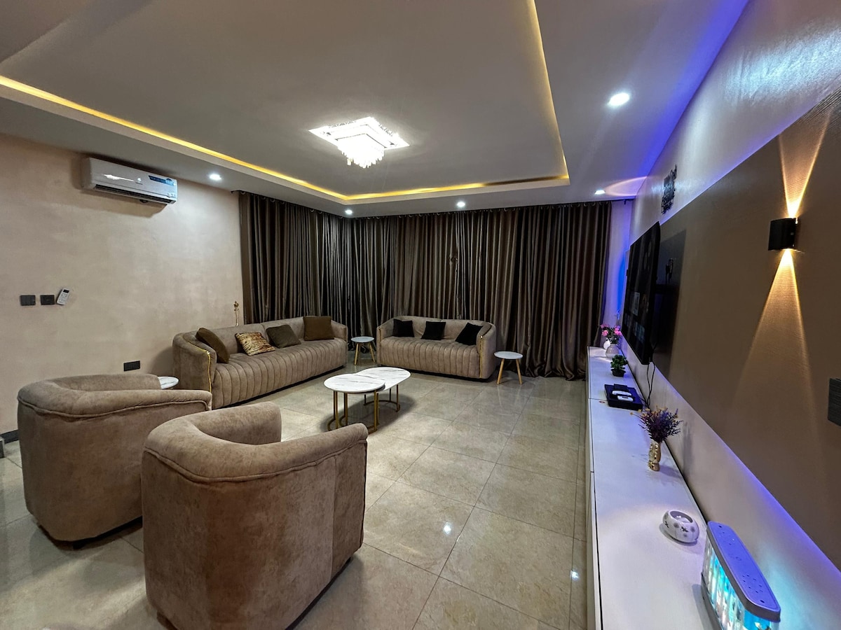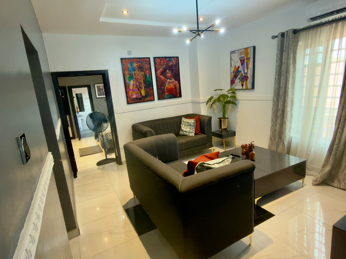 This beautiful apartment is located in a serene & secure environment & offers guests a home-away-from-home feeling.. Guests have access to fabulously-designed & decorated rooms/living room, a modern kitchen, Netflix/Prime streaming, unlimited internet, & 24/7 power supply (SEE HOUSE RULES ON ELECTRICITY ARRANGEMENT before booking). We deliver top-notch hospitality services to our guests, which makes us the perfect plug for your short & long term stays!