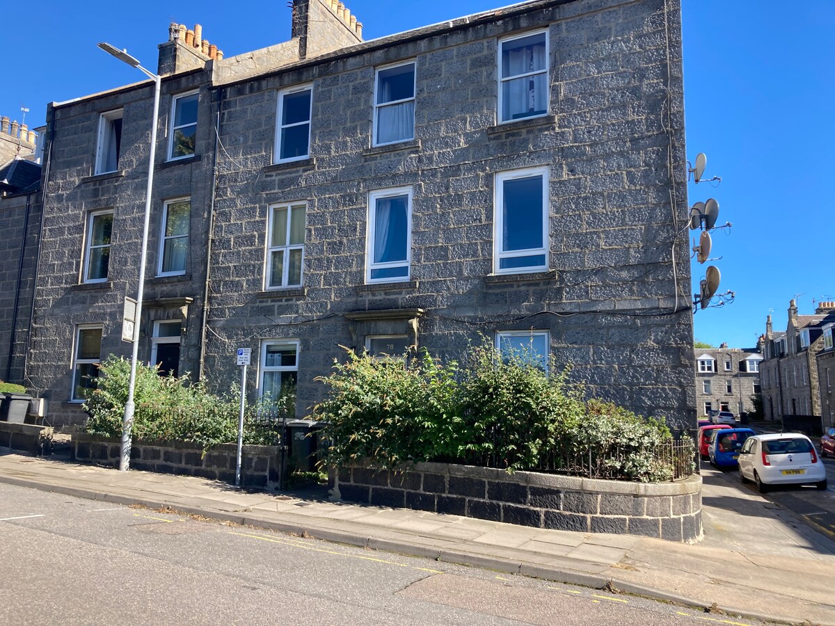 Whole flat with 2 bedrooms and a spacious living room in the center of Aberdeen. A fully equipped kitchen and a bathroom with shower. This flat on the second floor offers fast WiFi and a living space perfectly suited to business travellers as well as to tourists as a good basis for Golf and Whisky-tasting vacations or a stroll through the Highlands. High ceiling. No carpets - all floors „Laminate“.