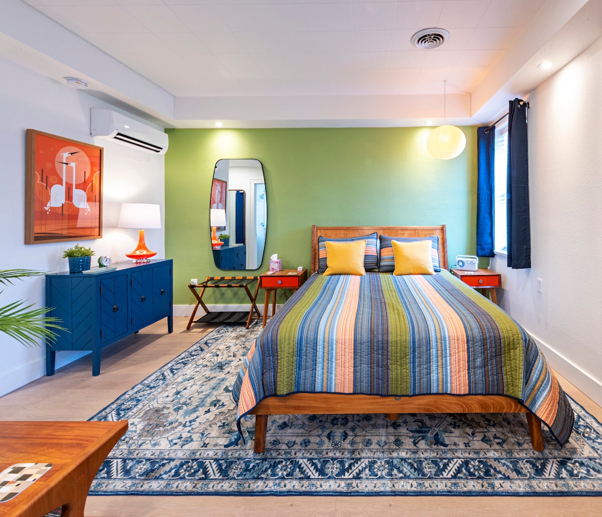 This colorful, hotel room-like apartment is all brand new. Located on the second floor of a historic downtown building, you will be close to restaurants, businesses and anything in town. Our tiny yet fully appointed kitchen has everything to prepare meals or simply warm them up. Custom-built furniture and lots of color make this one of the more unique rentals in the area. If we wouldn’t use it, we don’t include it. Stay for a night or a week. We’re confident you’ll find everything you need.