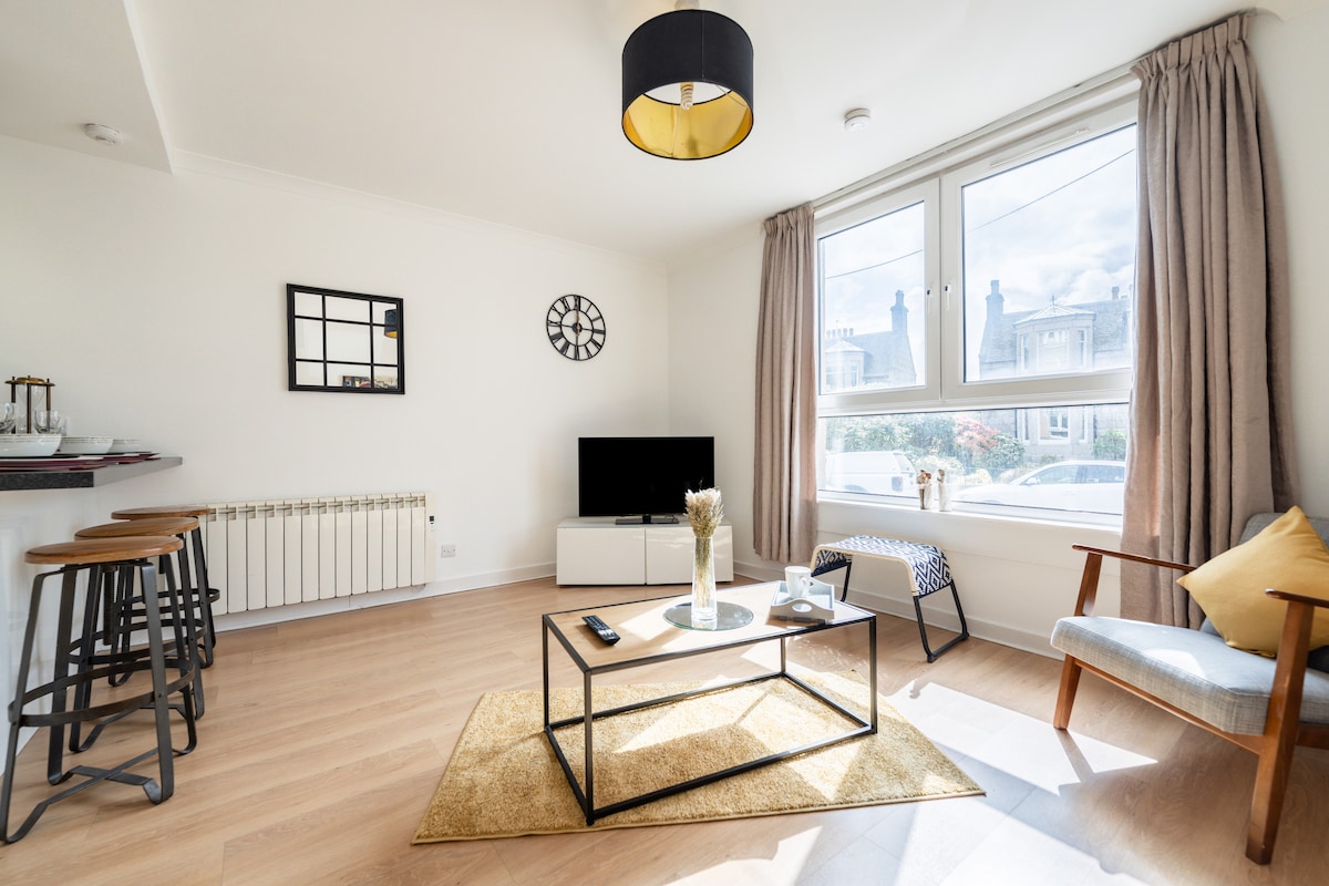 Recently renovated, our one bedroomed apartment is located a mere 10 minute walk from Aberdeen city centre along George street, a popular area with many unique shops. Spacious double bedroom with king size bed, 50" TV, wardrobes, chest of drawers, dressing table and floor standing full length mirror. Semi-open plan kitchen/lounge with ample seating, breakfast area and smart TV. Bathroom with luxury rainfall shower over bath. Bus stop 2 mins walk and free on street parking.