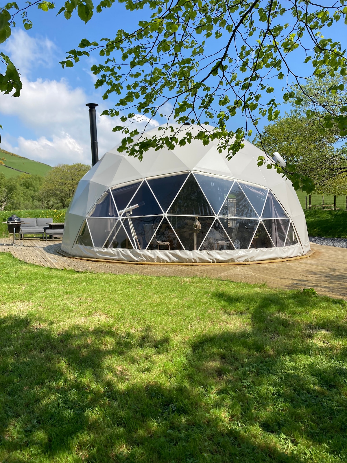 This uniquely luxurious glamping dome is situated in a tranquil and beautiful setting with no neighbours close by. This sumptuous self contained accommodation has all the high end features and lovely little extras that you need for a romantic getaway . It is located in its own unspoilt secluded setting surrounded by nature with breathtaking views . Enjoy the amazing deep copper bath or soak under the stars in the wood fired hot tub . Great location for stargazing . Wood is provided .