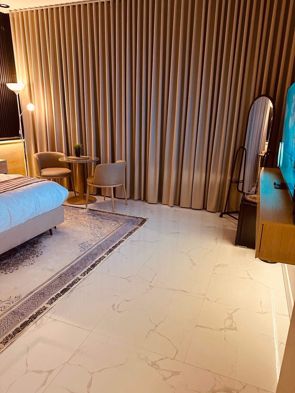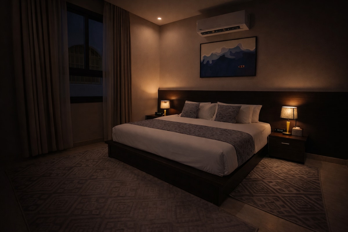 تقع الشقة في مبنى حديث و قريب من جميع الخدمات، وتضم غرفتين نوم واسعتين ومريحة. كل غرفة نوم مجهزة باسرة و مراتب فاخرة وخزائن ملابس واسعة لتوفير مساحة تخزين كافية. تحتوي غرفة الجلوس على شاشة سمارت 65 بوصة، مما يجعلها مثالية للاستمتاع بأمسيات السينما أو مشاهدة البرامج المفضلة بجودة عالية،و لضمان اتصالك بشبكة الإنترنت بشكل دائم وفرنا لك Wi-Fi مجاناً.