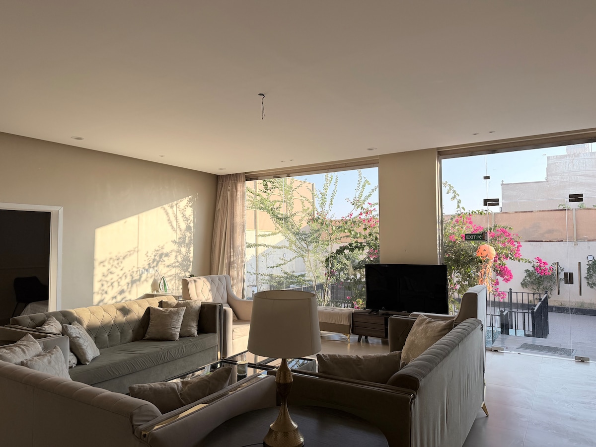 Stay in a luxurious residence near everything you want to visit. Amenities: • Al-Mansak Park and Walkway (1-minute walk) • Mosque (1-minute walk) • Commercial Street (1-minute walk) Apartment Features: • Courtyard (outdoor seating + charcoal grill) • Living room (seating area + TV + dining table) • King bedroom with private bathroom • Kitchen (coffee maker + refrigerator + electric and gas oven + grill + automatic washer and dryer) • Guest room with 4 beds and an en-suite bathroom