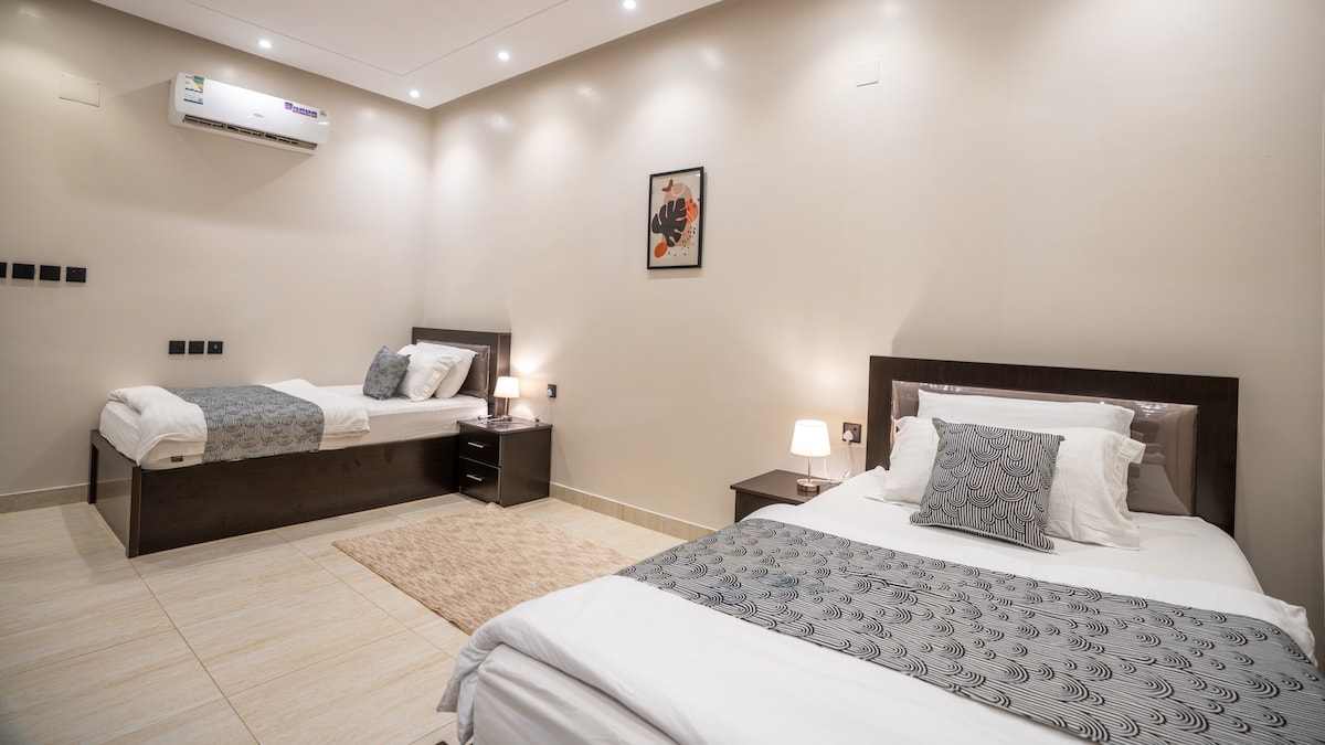 شقة واسعة مع صالة 20م²، غرفة ماستر وغرفة بسريرين مزدوجين، دورتي مياه (عربية وأوروبية)، مطبخ مجهز، إنترنت سريع، تلفزيون، تكييف، غسالة، مصعد ومواقف. Spacious apartment with 20 m² living room, master bedroom & double-bedroom, two bathrooms (Arabic & European), kitchen, internet, TV, AC, washing machine, elevator, parking.