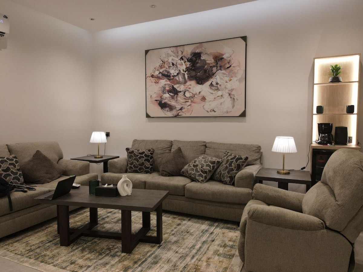 شقة ذات طابع أنيق وهادئ، مزوده بشبكه انترنت سريعه، مكونة من صالة وغرفة نوم فسيحة، وركن قهوة، بدخول ذاتي وخصوصية تامة. تتمتع بمدخل خاص، وقريبة من جميع الخدمات. تبعد عن المطار 15 دقيقة، وعن عسير مول 5 دقائق، ومستشفى الولادة 3 دقائق ، ويوجد خدمه توصيل وغسيل الملابس.