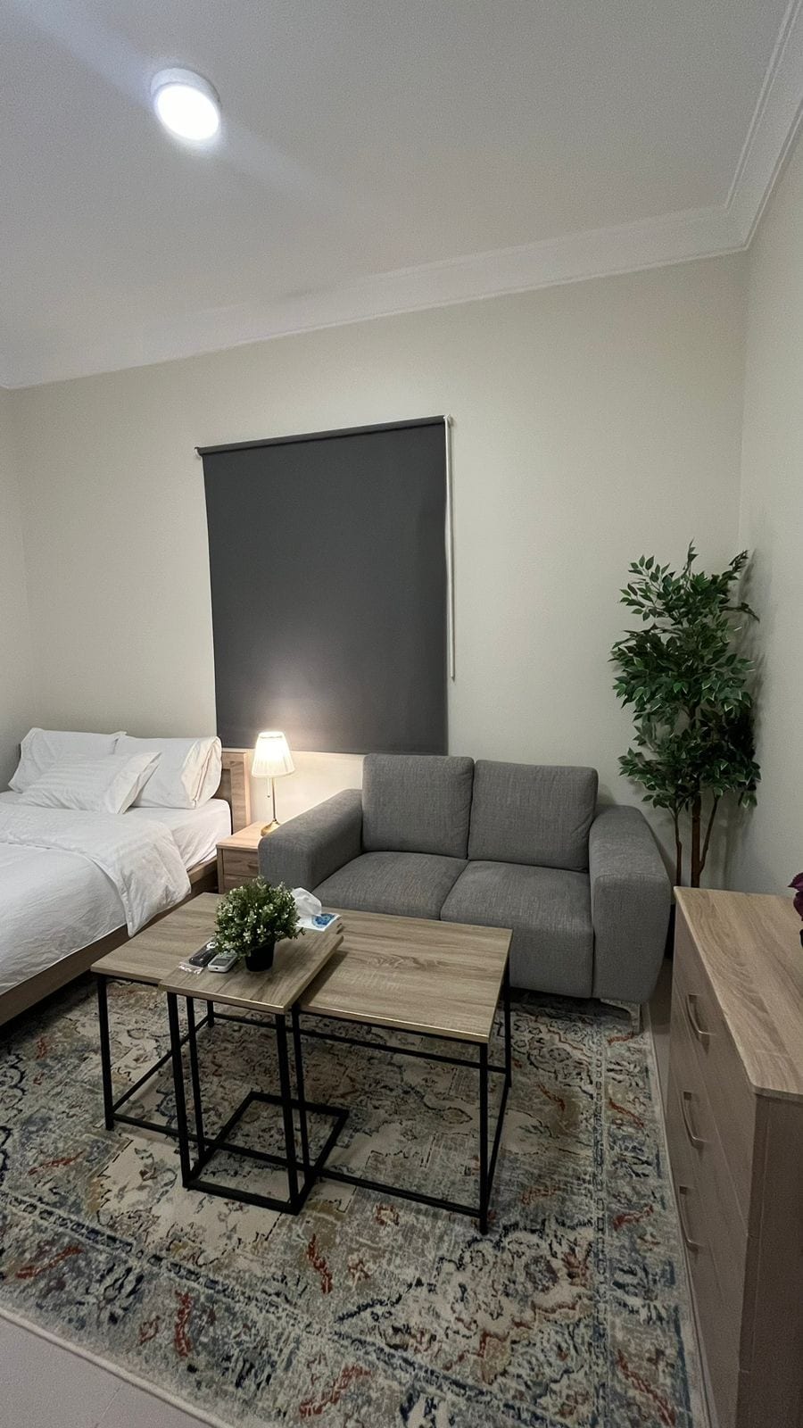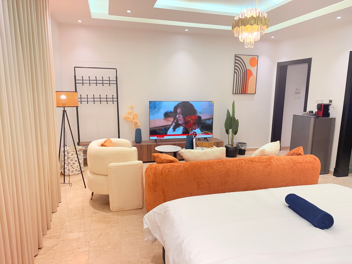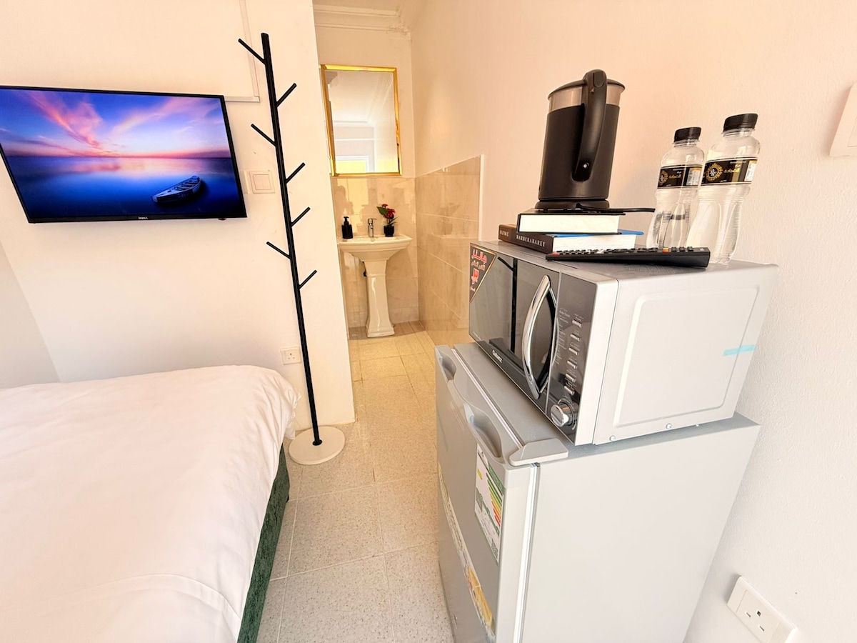 Welcome to our cozy private studio, designed for your comfort. 🚪Enjoy the convenience of Self Check-in with a smart keypad. Enjoy 5G wifi and a 75-inch TV with Netflix, Shahid, and YouTube Premium The bathroom is stocked with essentials like towels, soap, shampoo, and body wash for your convenience. Just a minute away, you'll find everything you need such as a mini-market, laundry service, barber shop, and restaurant