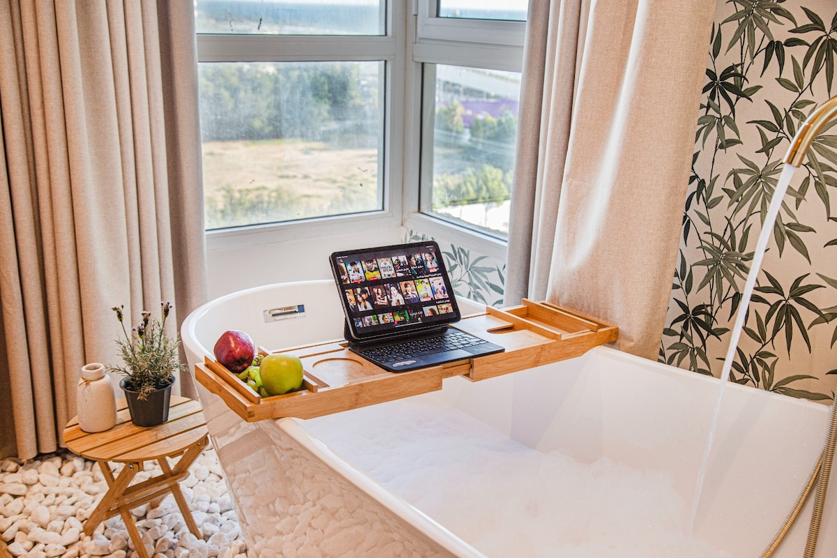 Enjoy a stylish experience at this centrally-located place. With an amazing 65” inch smart TV, Netflix , board games and more. Hot and cold tub. With an amazing location, Aziz mall is nearby ;), the location is close to everything you need, such as, restaurants, services, mall and airport.