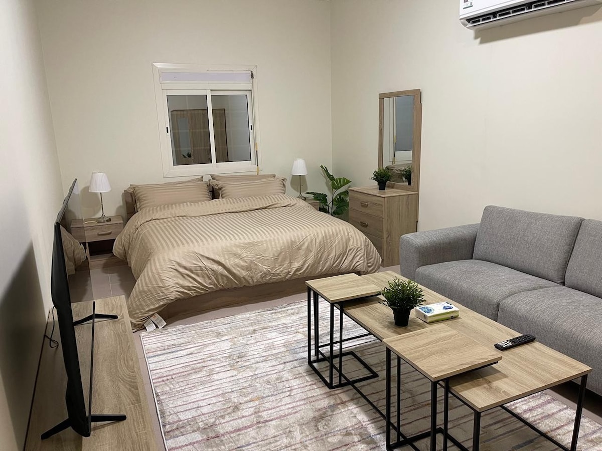 Welcome to our cozy private studio, designed for your comfort. 🚪Enjoy the convenience of Self Check-in with a smart keypad. Enjoy 5G wifi and a 75-inch TV with Netflix, Shahid, and YouTube Premium The bathroom is stocked with essentials like towels, soap, shampoo, and body wash for your convenience. Just a minute away, you'll find everything you need such as a mini-market, laundry service, barber shop, and restaurant