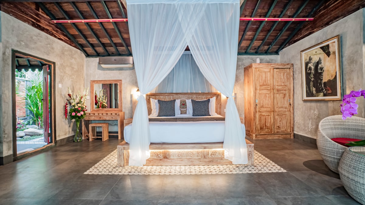 A luxurious classical Balinese escape. Leave the modern world behind to immerse yourself in private luxury and discover the essence of Bali in a natural playground alive with green fronds & sweet coconut aromas. The hum of Mother Nature rejuvenates you as shadows play across statues in the garden. Escape to this bespoke Balinese-style suite and feel the old gods of the island whisper to your soul. Unearth the true Heart of Bali in unique privacy. Warm smiles await you. Book your stay now.