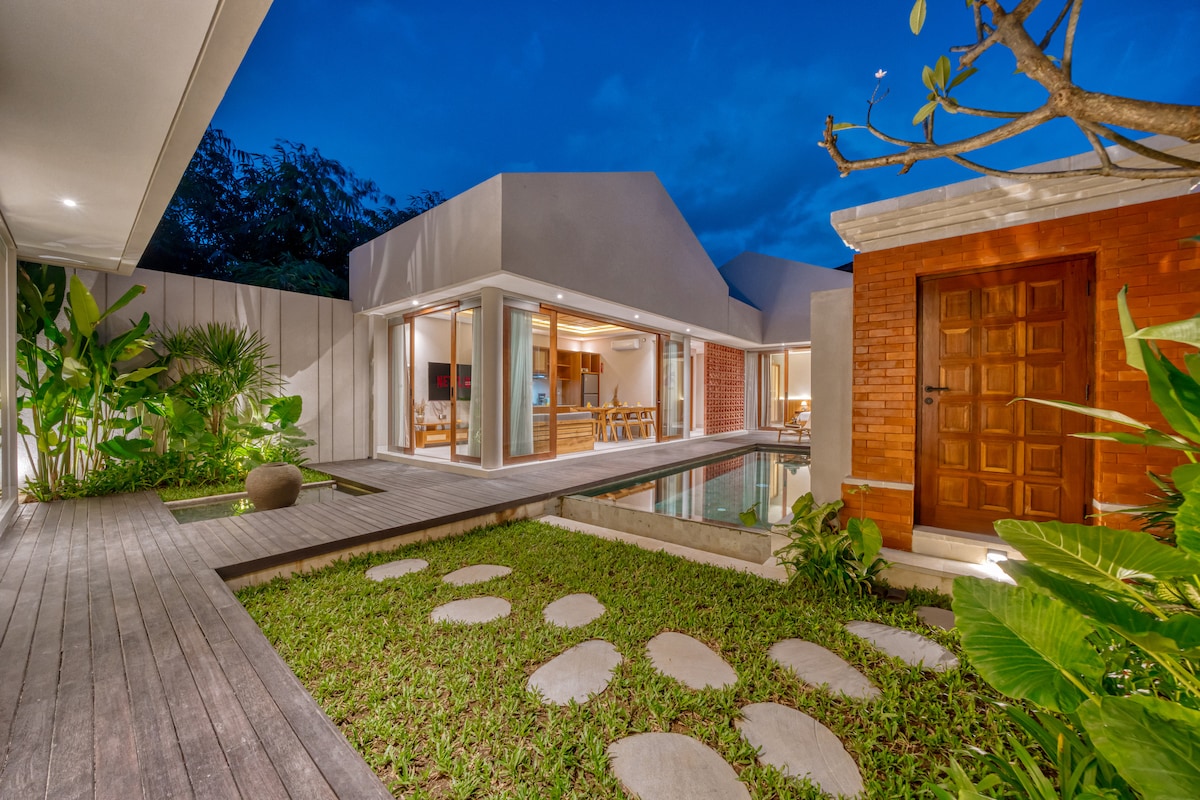 Luxurious private villa with 6x3 meter pool. Secure, private, safe. Lush garden and sheltered but open air kitchen for dining and relaxing by the pool. Queen bed, outside tub and shower, with fish pond view, fully equipped kitchen. AC, TV, great WiFi, daily cleaning and set breakfast is included. We are an 8 minute walk from the main road, or a short scooter ride. This means peace and quiet, and no car noise. Our staff will be happy to drive you in by scooter if needs be.