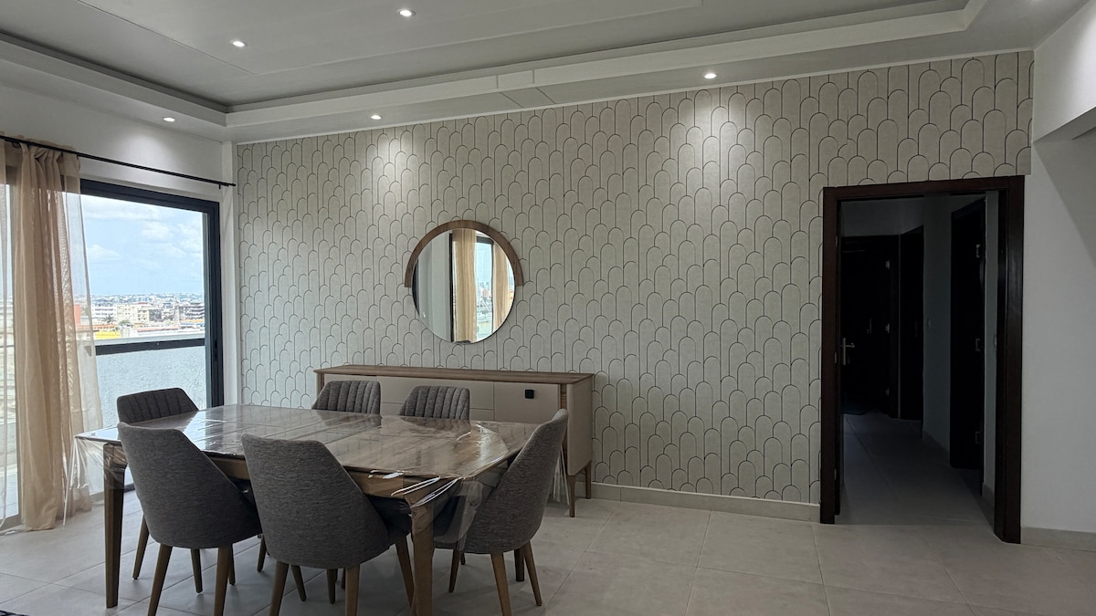 Profitez d’un appartement avec 2 chambres et ses 2 salles de bains avec wc, d’une cuisine tout équipée, d’une grande terrasse avec vue sur la lagune et d’un grand salon à vivre situé dans une résidence récente et sécurisé par 2 gardiens et un concierge 24h/24h à cocody danga qui possède une piscine sur le toit avec une vue 360degres sur Abidjan (unique). Appartement récemment rénové et décoré avec goût. L’endroit parfait pour passer un agréable séjour à Abidjan et pour visiter ses alentours.