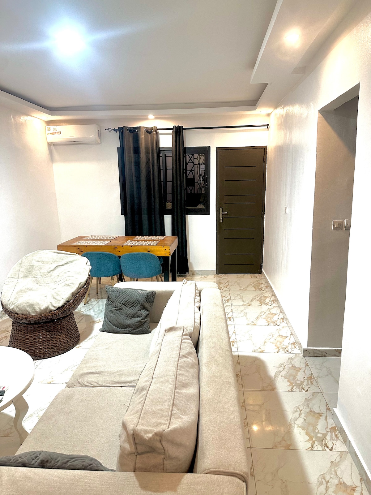 Welcome to « Le Cocon d’Aïah« —our spacious one-bedroom apartment located in Cocody, Abidjan. Designed to combine comfort, privacy, and convenience, this one-bedroom apartment offers a quiet and welcoming setting for your business or personal stays. It features an airy living room, a comfortable bedroom, a fully equipped kitchen, and high-speed Wi-Fi.