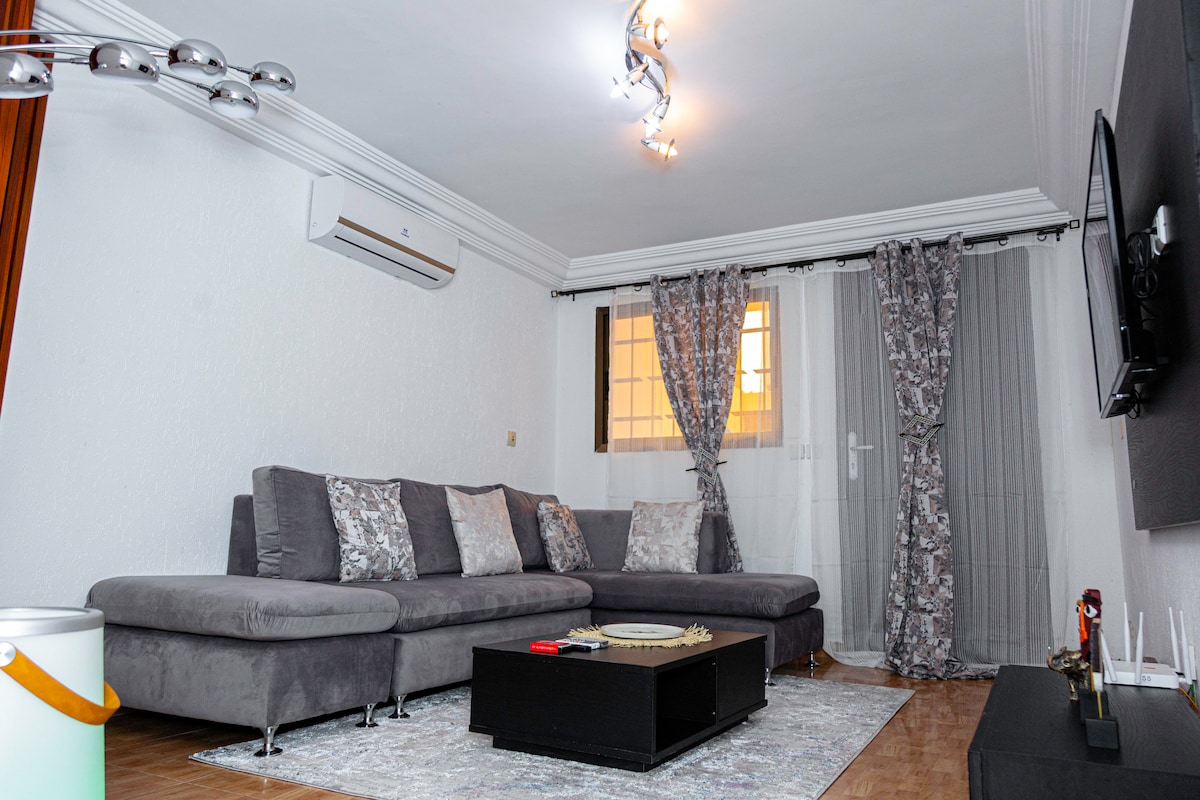 Détendez-vous dans ce logement calme et élégant. Situé dans une cité fermée avec des agents de sécurité disponibles 24h/24 7j/j avec un accès très facile . À proximité d’un super marché et des banques . Il y’a la possibilité de louer sans le jacuzzi.