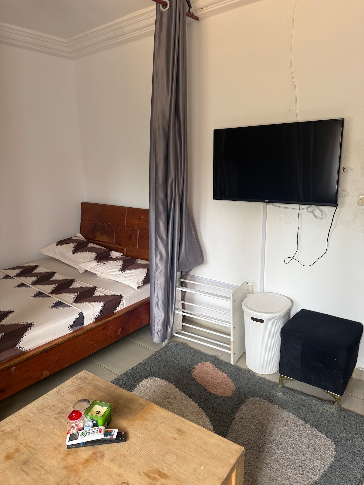 Beau studio sécurisé avec gardien de jour et de nuit.Accès facile Rez de Chaussée avec ouverture sur une petite terrasse. il dispose d'un grand écran de 55 pouces, un coffre fort, une enceinte Bluetooth avec un son de qualité Harman/kardon, un lave-linge, un fer à repasser , Robot aspirateur , assistant Vocale connecté , purificateur d'air et autres équipements. Le sol de la chambre est vêtu d’un parquet flottant