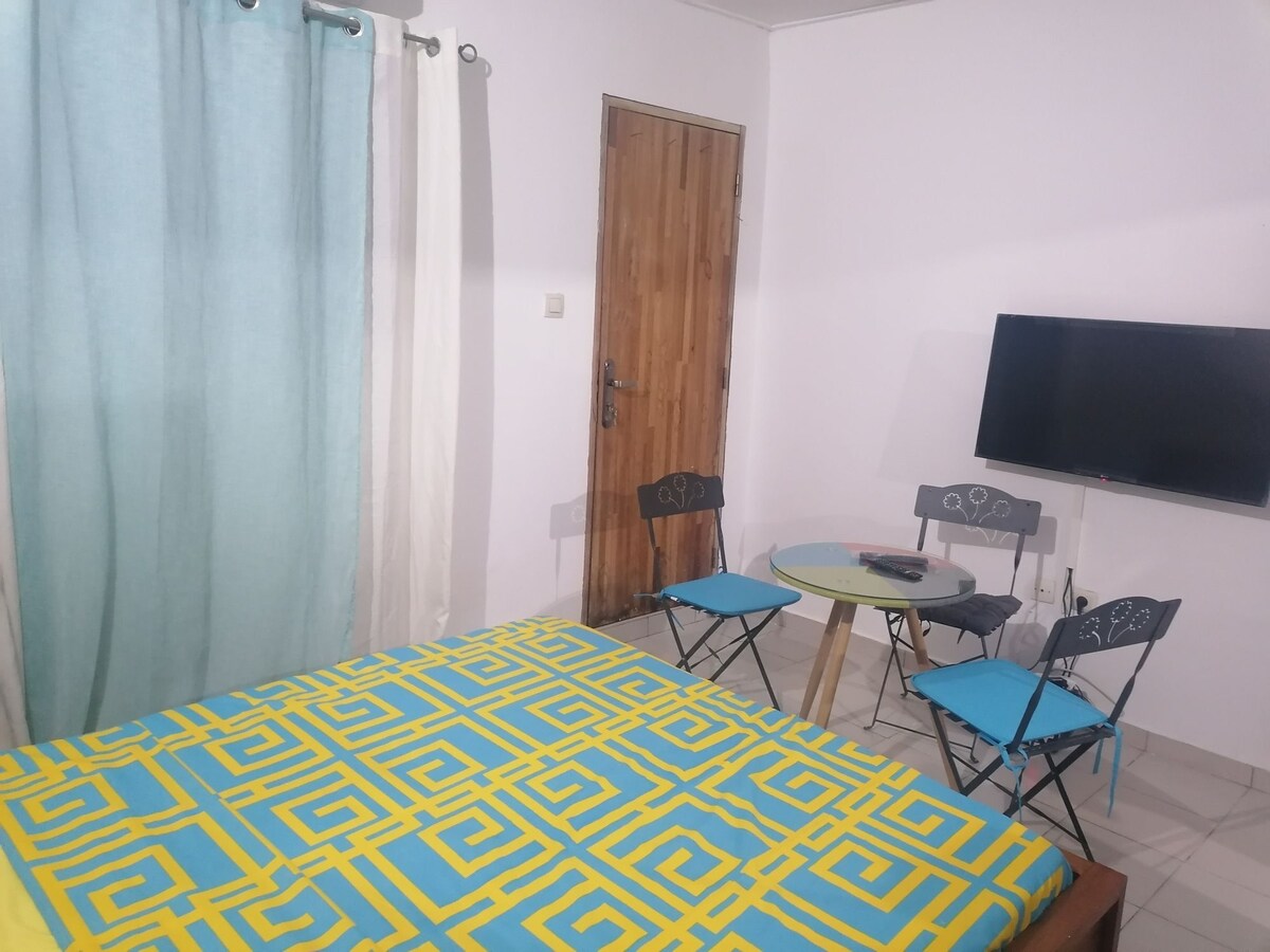 Le studio est petit, indépendant à l'arrière d'une maison. Salle de bain attenante. Vous serez au calme en zone 4, à 10 min de l'aéroport au cœur de la vie Abidjanaise. Vous trouverez à moins de 5 min à pied tout ce dont vous avez besoin. Supermarchés, restaurants, boite de nuits, banques, cinéma,salle de sport...
