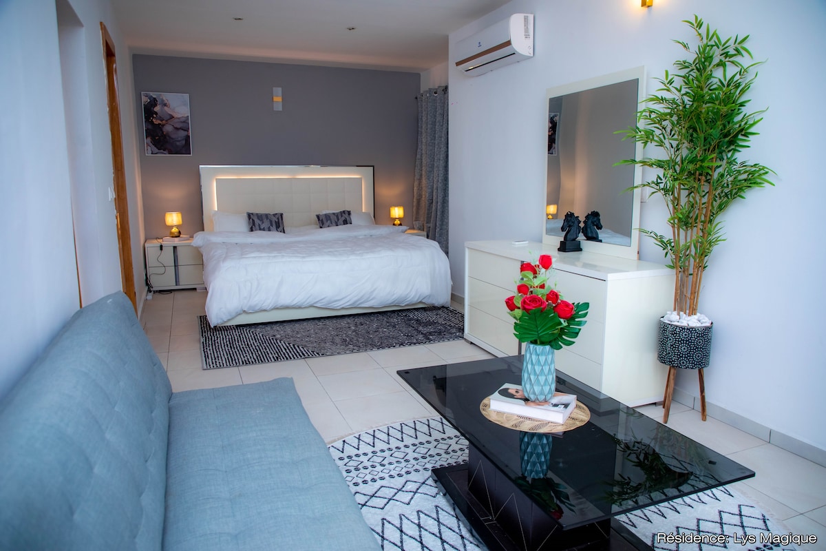 Au coeur de Cocody, entre le Vallon et la Riviera 2, proche des jardins de l'université, découvrez une charmante petite maison de type extension en géo-béton (briques de terre crue). L'appartement dispose d'une chambre climatisée, 1 salle de bain, d'un canapé convertible en lit, d'une terrasse extérieure, et d'un accès illimité à la piscine et au jardin! Vous profiterez de tout le confort moderne d'un logement calme, propre, et bien aménagé.