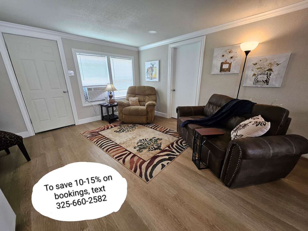 Escape to The Nook, our cozy and comfortable 1-bedroom, 1-bathroom retreat in Abilene! Relax and unwind with the convenience of a TV and a kitchenette, with complimentary coffee provided. Our quiet and safe neighborhood is just minutes away from ACU, HSU, Hendrick Medical Center, and The Abilene Expo. The Nook is also conveniently located near shopping and restaurants. Book now for a memorable stay in Abilene!