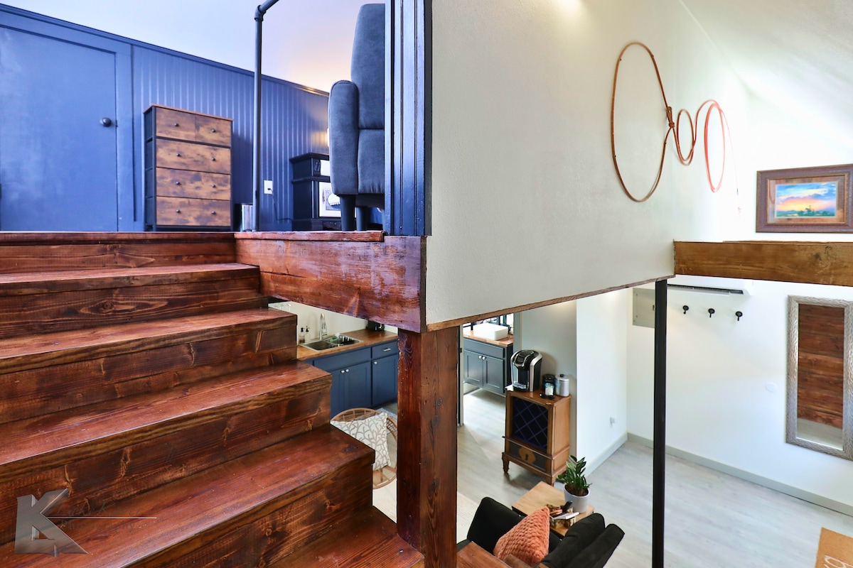 This sophisticated retreat, laced with western tones, sits less than 1/4 mile from Hardin-Simmons University and Hendrick Medical Center; 2 miles from Downtown Abilene dining, shopping, and entertainment. The ground floor features a snug living space, full-size appliances in a stocked kitchen, and the sleek sky-lit bathroom. Upstairs, relax in the lovely navy bedroom designed for a soothing sleep. We hope you’ll find this apartment to be a luxurious oasis coming off the dusty trail!