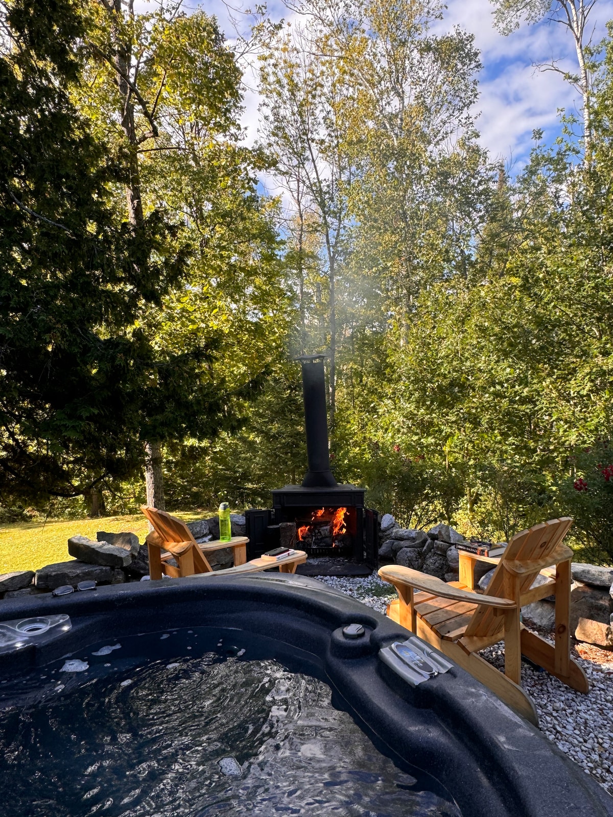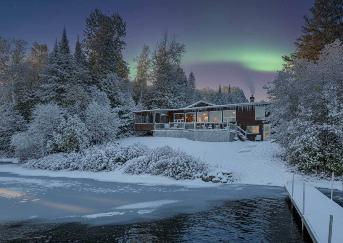 Escape to Chalet Pura Vida, a cozy lakefront retreat surrounded by forest and perfect for a romantic fall or winter getaway. Enjoy sunsets from the hot tub, cozy nights by the wood stove, or movie evenings with Netflix. The 1-acre property offers peace, privacy, and comfort: Hot tub with lake view Wood stove & rustic décor Fast Wi-Fi & Smart TV Fully equipped kitchen Private dock & canoes (summer) Your perfect nature escape year-round.