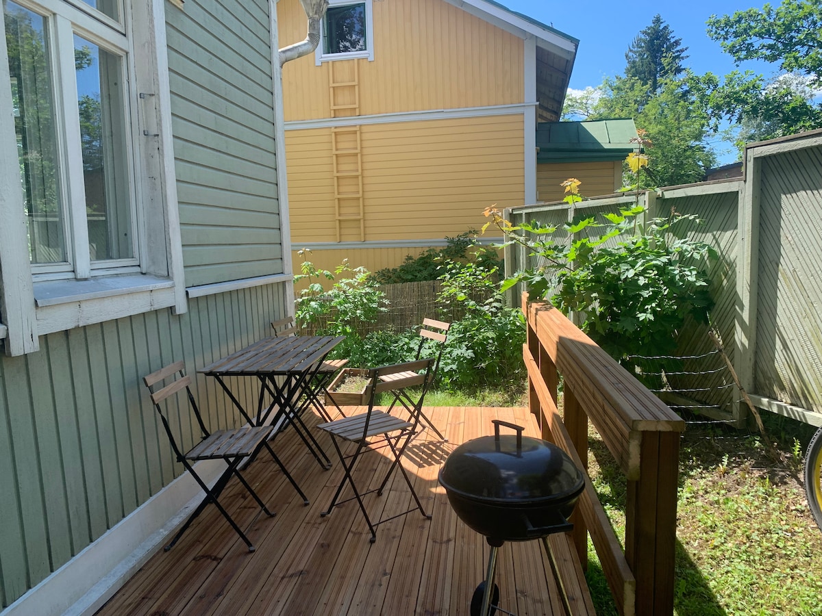 A funky compact one room flat in a wooden house nestled in a quiet & beautiful neighborhood.Features a kitchen, bed is up in a loft, sofa, kitchen table, toilet, wooden sauna and a shower. Underfloor heating throughout the apartment. There is a small yard and terrace where you can enjoy your breakfast outdoors. Travelers have access to entire apartment. Sheet and towels are included. There is only 300m to grocery store and 1.2 km to center.