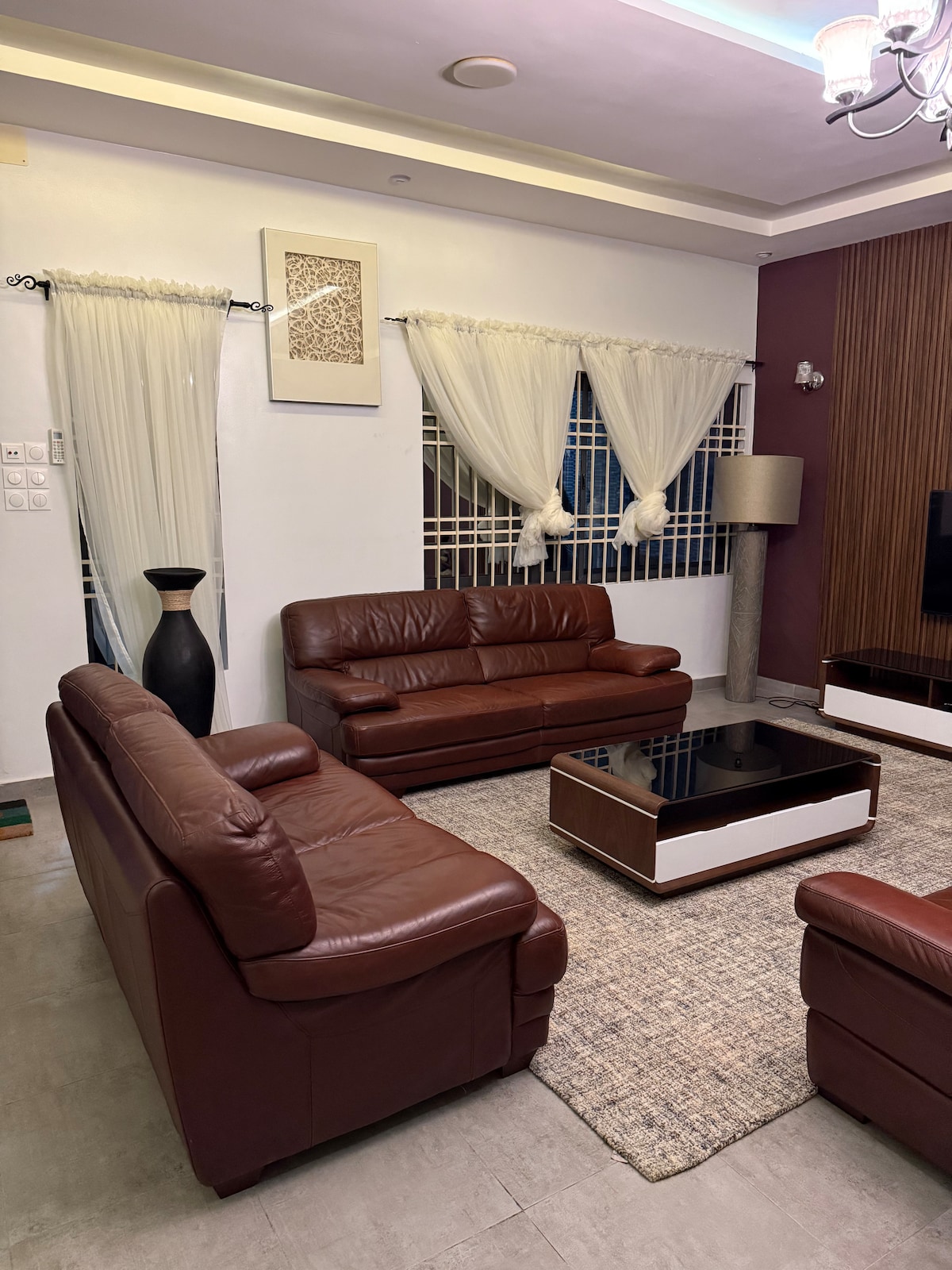 Welcome to this modern and spacious studio apartment in Cotonou— your perfect home away from home in a quiet, safe neighborhood. Enjoy a fully equipped kitchen, a cozy living area with comfy sofas and a smart TV, a dining table, and a private bedroom and bathroom. The space is bright, clean, and thoughtfully designed for relaxation or work. This beautiful appartment is pnly a short drive from the airport, it's close to upscale restaurants in Haie vive and also near supermarkets and shops