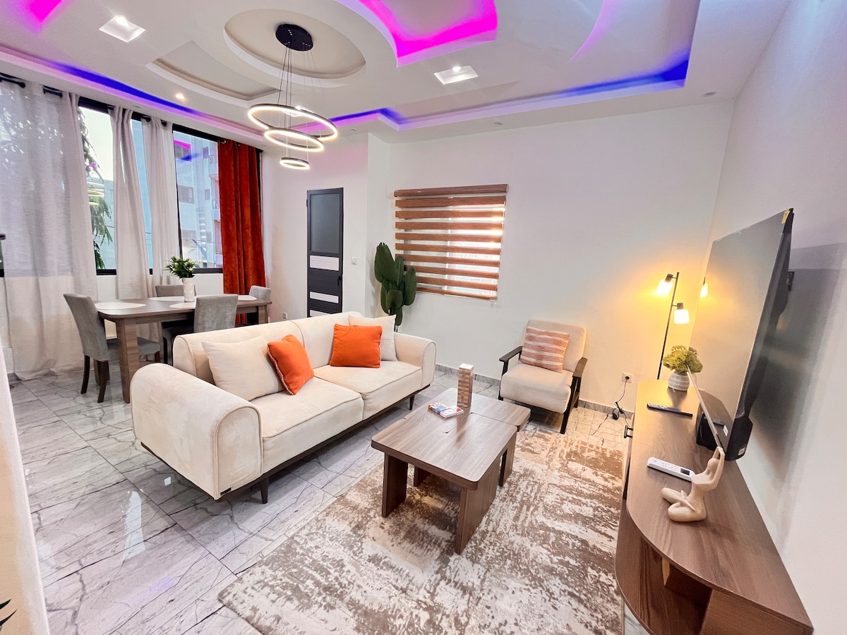 Logement de haut standing situé dans un quartier très calme, affiche un style résolument unique de part le confort qu'il offre. Situe au 1 er et dernier étage, il dispose d'un grand séjour très spacieux avec un beau balcon aménagé, de deux grandes chambres, chacune avec leur salle de bain et toilette séparé, une cuisine full équipé, une salle de détente pour prendre un bon bain devant la télé. Il est situé à : 25 min de l'aéroport 5min de la plage. Appartement entièrement climatisé.