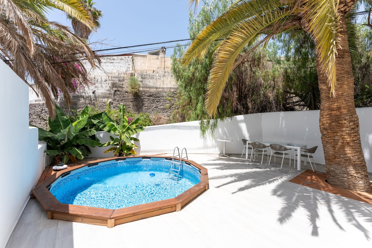 Smile while discovering every corner of this welcoming first floor home. Inside, enjoy the architectural details like the stone wall and the wooden cathedral ceiling. More than 70% of electricity consumption is self-generated thanks to our solar panels. Sustainable home :) Then head outside to the balcony for the views and the backyard, chill out area, and now, a cozy tiny pool (2x2m) for resting, sunbathing, and chill. Internet Fiber Optic 300mbps to work and enjoy it. Eduardo & Daniel are at your disposal to organice your holidays and help along your stay. Do not doubt to write us! It is difficult to find such an accessible property, in a traditional Canarian construction house, with quality materials, and in addition to being in the center of the town, it gives the feeling of being rural, surrounded by vegetation and where you can hear the singing of birds. Access and Terrace Through the external iron staircase, you go up to the first floor, where you will find the private terrace, which with a cheerful and careful decoration welcomes guests to their home. From it, you can see the horizon (in the distance, the sea) and enjoy the pleasant sunsets of the north of Tenerife. You will be constantly accompanied by the sound of the birds that nest around the house and in the green areas that surround it. The attic From the private terrace, you access this penthouse, unique for its structure and materials. In the diaphanous room as a loft, there are the kitchen and dining room, a living room, a bathroom, a work area and the bedroom space. What really stands out is the quality of the traditional construction and the perfect combination of the materials, one meter thick stone walls, and the roof of the traditional roof, gabled. The floors and ceiling of mulberry wood, give warmth to all the space that has been completely renovated thinking of a perfect stay. The entire attic receives natural light :) The kitchen The kitchen is fully equipped with fridge and freezer, microwave, induction hob, water heater and dishwasher, as well as all the necessary elements, electric coffee maker and toaster, and complements such as salt, sugar, oil or vinegar so that from the first minute you can start with the preparation of food and cooking preparing your own menu. You have a coffee machine and courtesy capsules to start the day in good shape. If you want to drink tea, remember that there will also be a teapot for you to prepare yours! The lounge The living space, cozy and well decorated as the rest of the house, has a comfortable sofa, equipped bar furniture (with drinks from many corners of the world, kindness from our guests), Smart TV with access to Netflix and a music device through bluetooth. Bathroom In the bathroom, there is a comfortable shower tray, and equipped with a hairdryer, bath towels and a set of towels for the beach are supplied. You'll find toilet paper, as well as soap for the sink and shower gel. In case you need additional sets of towels, you only have to request it, and it will be immediately placed at your disposal. Weekly a new set of bed and towels is delivered in case your stay exceeds seven days. Private garden Through a door, you have a private and exclusive area overlooking a pleasant garden that surrounds the entire property, with a relaxing space for relaxation, where you can sunbathe or have a drink by candlelight, or simply enjoy reading. In these spaces you have at your disposal an outdoor shower to cool off surrounded by greenery. Internet and workspace or reading The penthouse has wifi coverage throughout the house, and the study or work area has natural light with unbeatable views of the garden through the window, books in Spanish and magazines if you want to learn or read practicing our language, or simply enjoy reading. Rest. XL bed And finally, most importantly, you will rest in a bed equipped with a quality mattress, 1.60 by 2.00 meters, large enough to sleep peacefully until the next day. You have independent reading lights and a closet to store clothes, shoes or whatever you consider your luggage. For the rest, enjoy your stay in a place prepared with care to share the best vacation experience!!! The hosts, together with our Maltese Moma, live on the ground floor of the main house. The attic is accessed through an external staircase, completely independent. The parking and the laundry area (washing machine and dryer) are common spaces that are available to guests at all times. You access the garage through an automatic door with a remote control that we will provide you as soon as you get home :) In addition to the independent access to the attic through the exterior staircase, you will find the door that connects with the private garden where you can enjoy comfortable chairs and the outdoor shower to cool off. The main advantage is that, respecting the privacy of the well-defined independent spaces, you have us at your disposal at home, by phone or WhatsApp for any question, recommendation, surprise that you want to prepare your partner or problem that may arise during your stay. The environment is calm and within the historical centre of Tacoronte, a small town in the the north of the Tenerife island. At 10 minutes driving it is the beach and natural pool of Mesa del Mar and other small towns. From the penthouse you have easy access to the north motorway (TF5) to quickly visit the rest of the island. If you do not have a car, there are several bus lines in the neighborhood. Do not hesitate to write us if you have more questions! Whether you decide to rent a car during your stay and enjoy your own schedule and the convenience of having private parking, as if you do not need a car, the penthouse is well located in the center of the town, with a bus stop nearby that will allow you to move through the island to the main destinations. It is 50 minutes from Tenerife Sur airport (TFS airport) and 15 minutes from Tenerife North airport (TFN airport). Taxis are not expen
