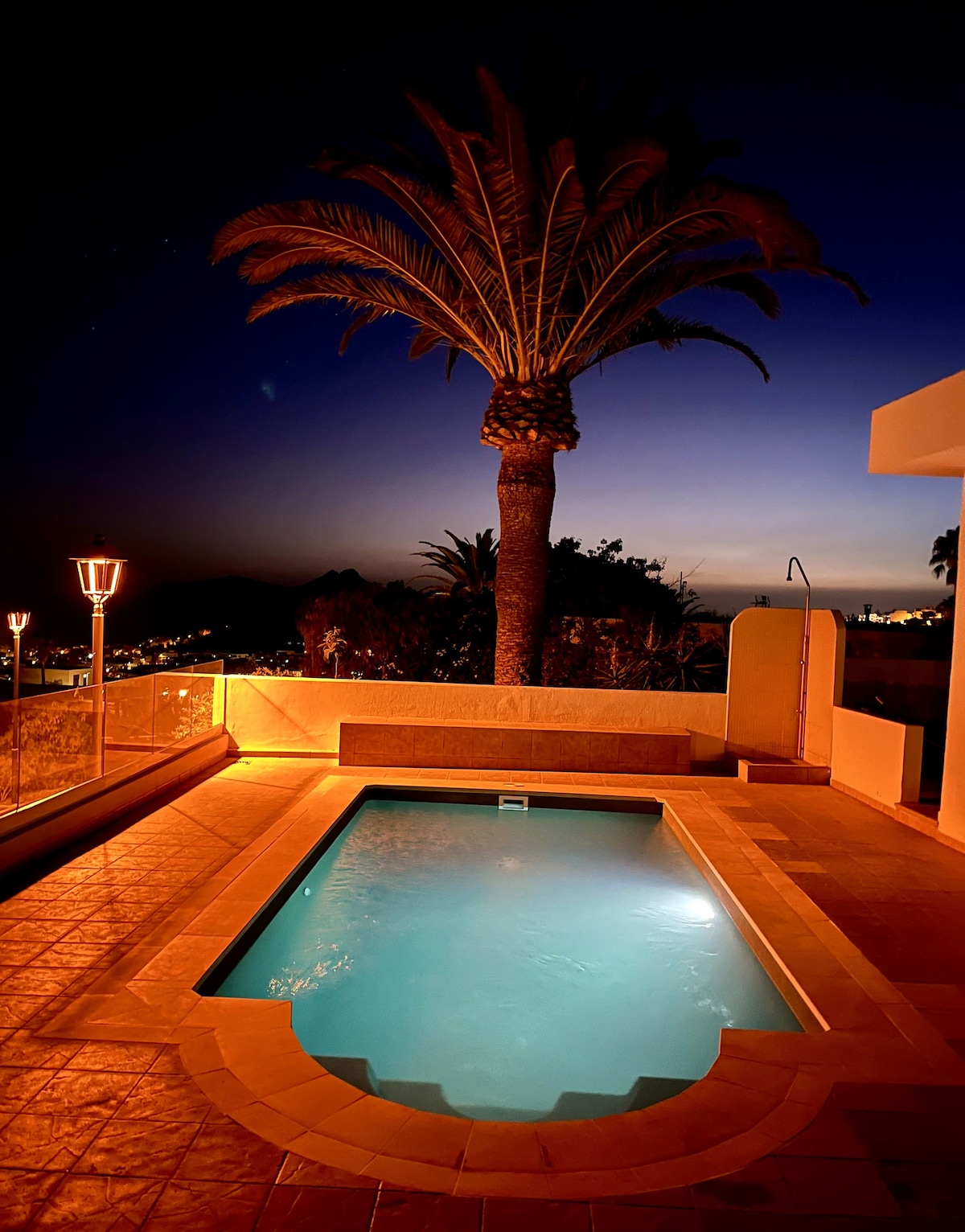 Villa Evelyn is set in a peaceful and idyllic location in Tenerife South. Villa Evelyn stands in an exclusive area, known as "LA FLORIDA” which predominantly houses private villas, close to some of the most desirable Golf courses on the island as Golf del Sur, Las Americas Golf course, Los Palos Golf course in Guaza and the prestigious Costa Adeje Golf Course. Los Cristianos and Las Americas are only 10 minutes driving away.