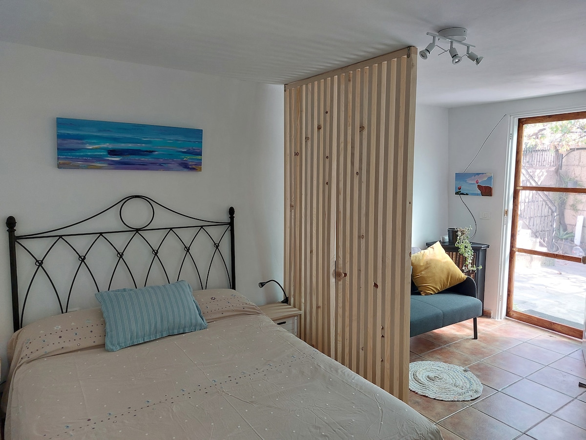 Casa de invitados en nuestro jardín. Esta casa de invitados es ideal para una o dos personas que busquen un poco de tranquilidad, pero no quieran alejarse de la zona urbana. La casa, tipo loft, cuenta con una cama de matrimonio, salón-comedor, cocina y baño con ducha, además de un escritorio. Su jardín, rodeado de árboles frutales hará que disfrutes de la naturaleza en todo momento. La cocina está totalmente equipada: calentador de agua, cafetera, tostadora y microondas. También hay lavadora.