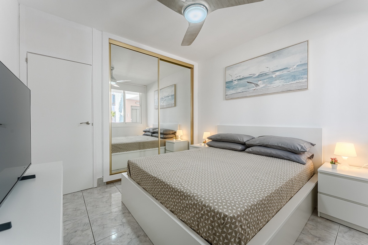 Apartamento totalmente reformado en el complejo Azahara 3 en Los Cristianos a pocos pasos de Playa Las Vistas. Dispone de luminoso salón con aire acondicionado y ventiladores de techo, cocina nueva equipada con lavadora, secadora y lavavajillas, baño renovado con plato de ducha, espacio de trabajo con escritorio y dos Smart TV Samsung.Un apartamento moderno, cómoda y lista para disfrutar de sus vacaciones en una de las mejores zonas del sur de Tenerife. La ubicación es increíble.
