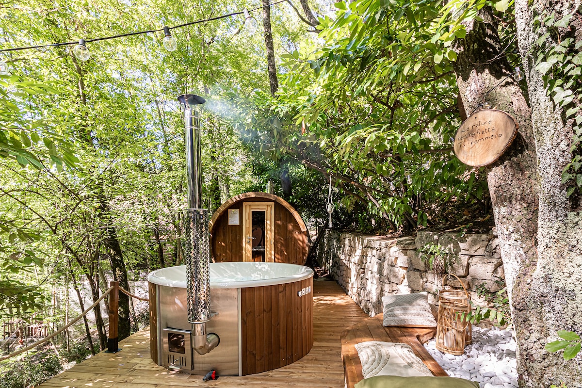Our treehouse in the woods, built from iron and originally used as a bivouac, has been transformed into a retreat inspired by Japanese philosophy. Inside, it offers a unique experience with an ofuro (traditional Japanese bathtub), a sauna for relaxation, and an emotional shower that stimulates the senses. The minimalist design and attention to detail create a serene atmosphere, perfect for rejuvenating in harmony with the surrounding nature.