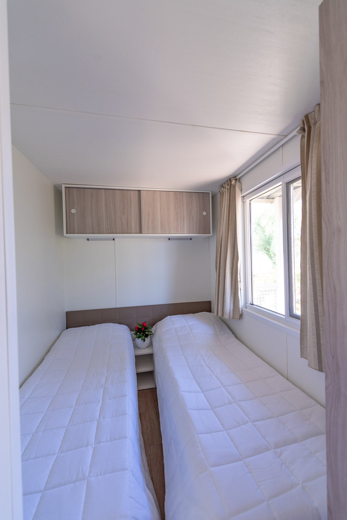 Animali ammessi. 32 mq + veranda con cancelletto, 1 camera da letto matrimoniale, 2 camere con 2 letti singoli, soggiorno abitabile con tavolo e sedie, cucina completa di stoviglie, frigorifero, fornello e forno a microonde, TV LCD, aria condizionata/Riscaldamento senza limiti di utilizzo, 2 bagni con wc, lavabo e box doccia. Veranda esterna in legno coperta, tavolo e sedie da giardino per il relax in veranda, posto auto esterno negli spazi riservati in struttura.