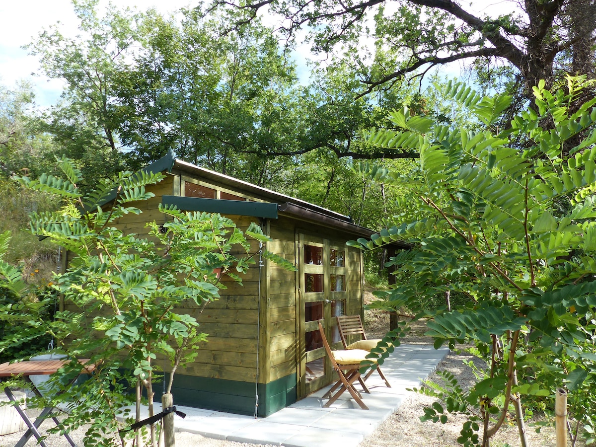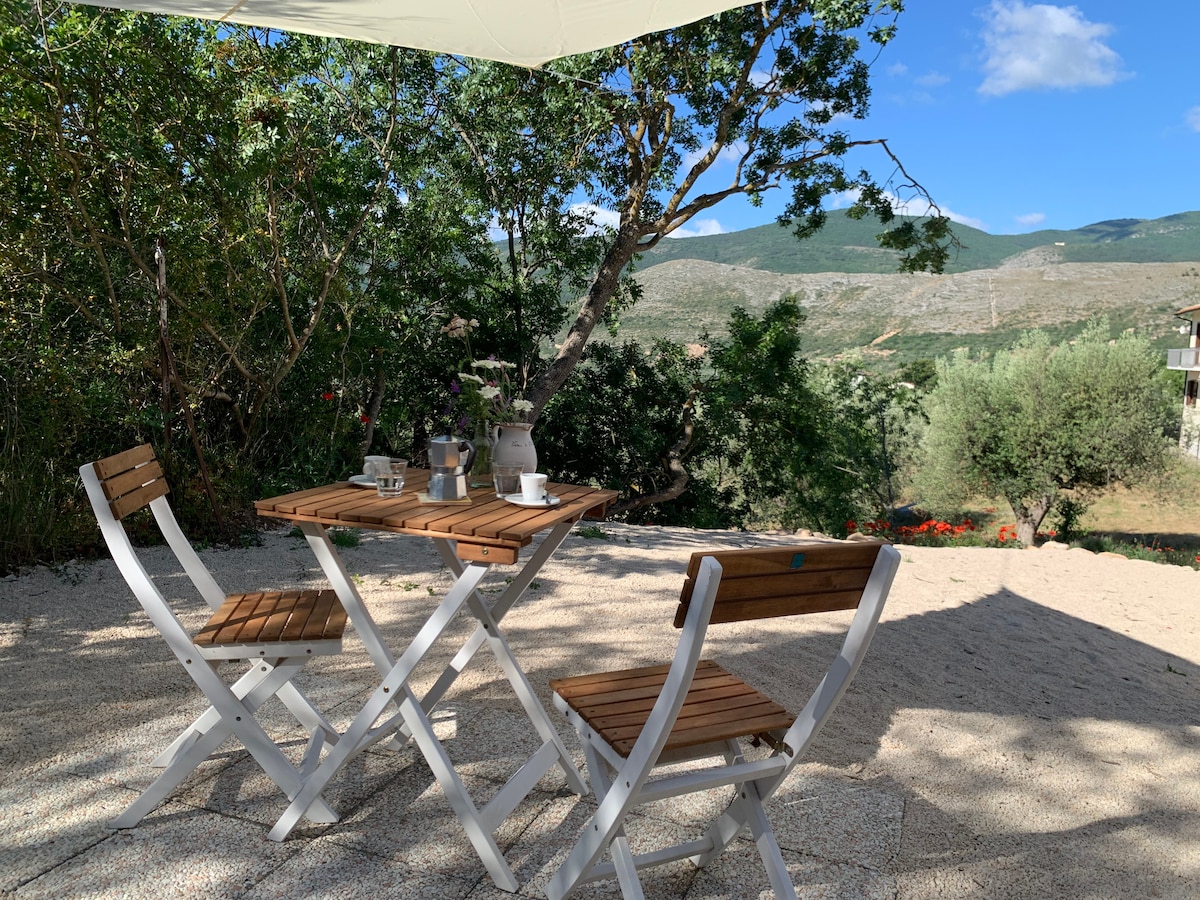 The cosy log cabin is located separately on a small-scale nature campsite, between ancient olive trees. The hut has a living area including a kitchenette and a sleeping area for two people. Around the cabin you can see the peaks of the Gran Sasso on one side and the high mountains of the Majella on the other side. At the terrace there's a lot of privacy. The municipal access road to the site is a little steep. Within walking distance you can find a pizzeria and during the weekend an agriturismo.