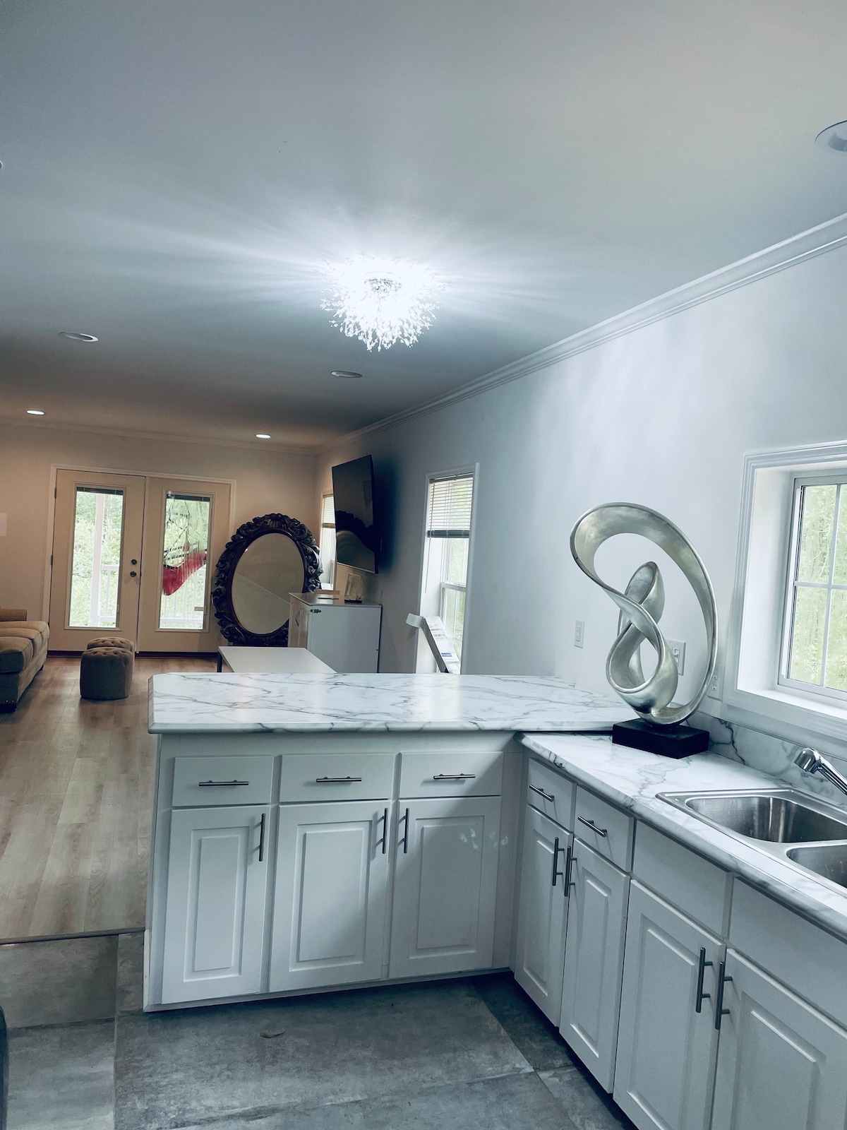 A beautiful, open , airy, and uncluttered 1000 sq home, 2 bedrooms, 1.5 baths, sleep 6. Cool crisp modern decor, gourmet kitchen granite , upgraded appliances, 5 burner gas stove, W/D , DW, ninja ground coffee maker, micro, toaster and ninja blender shake maker. Latest tech with high speed internet in and outside through Cisco Meraki systems , 75 '' TV smart with subscriptions to premium offerings and Alexa. Relax on our large covered deck with hammock chairs and watch the deer walk by.