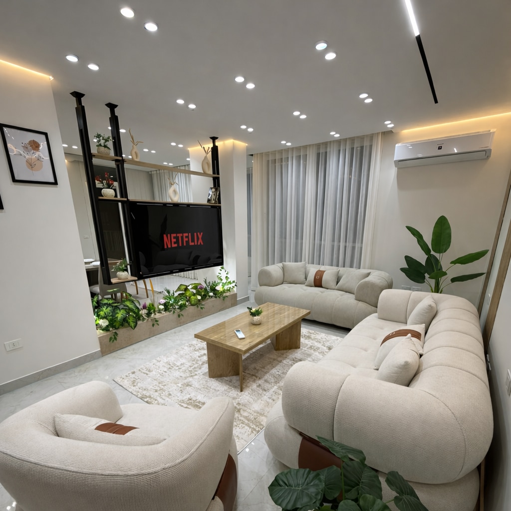 静かで落ち着く和モダンなお部屋。 ザマレク中心で、アクセスもかなり良いです。 Designed in a calm Modern Japanese-Inspired by Wabi-Sabi, this spacious 2 bedroom apartment blends warm wood tones, clean lines, and soft lighting to create a peaceful city retreat. The interiors balance Japanese simplicity with Scandinavian comfort, offering welcoming atmosphere. The open living and dining area feels airy and functional, with large windows that bring in natural light and highlight the minimalist furniture and natural textures.